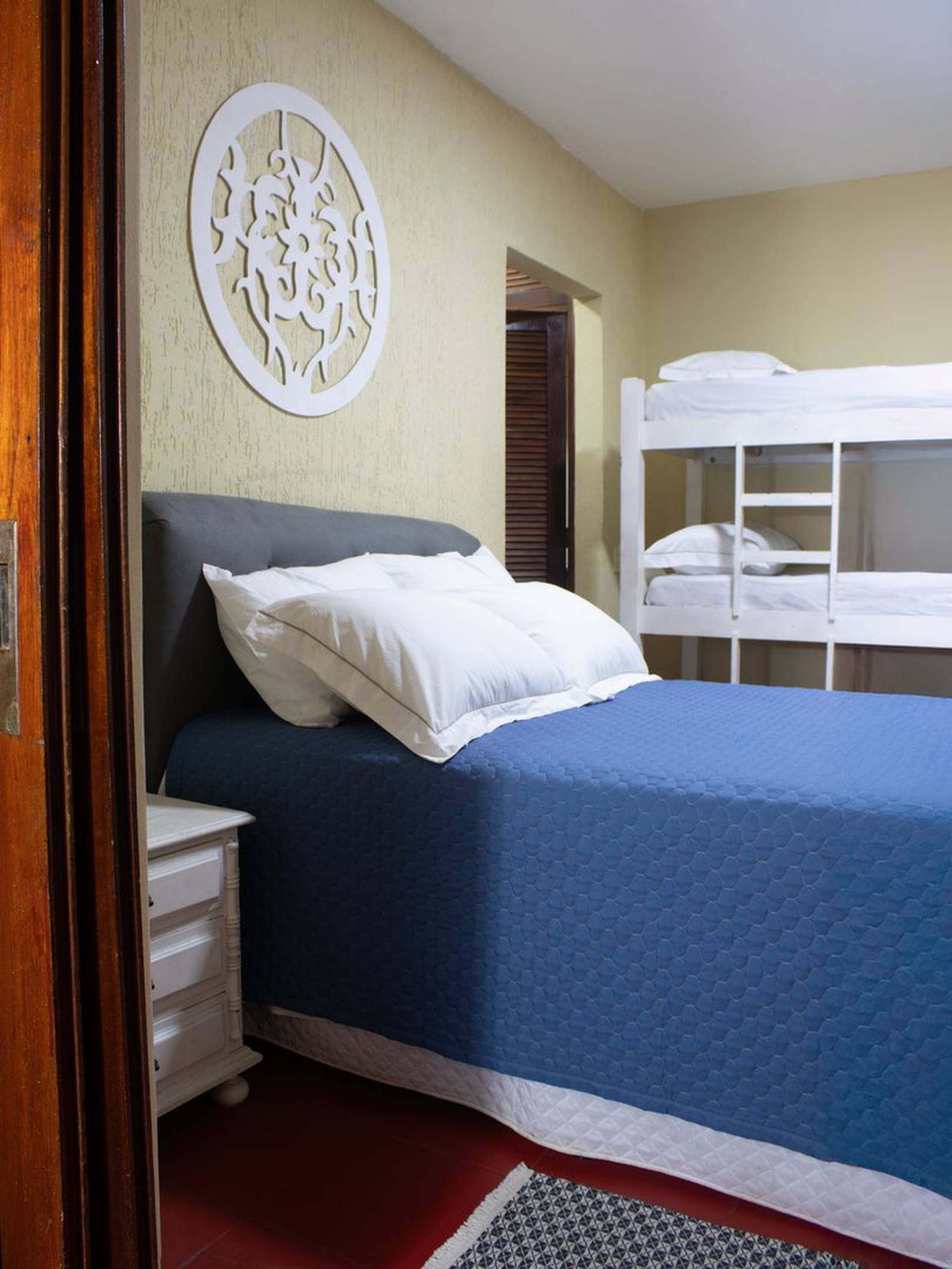 Acomodação perfeita para 05 hóspedes com uma cama casal + um triliche, TV 43” com pacote de canais Vivo TV e as seguintes comodidades: