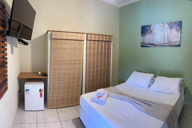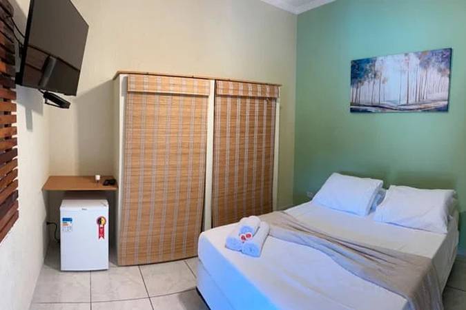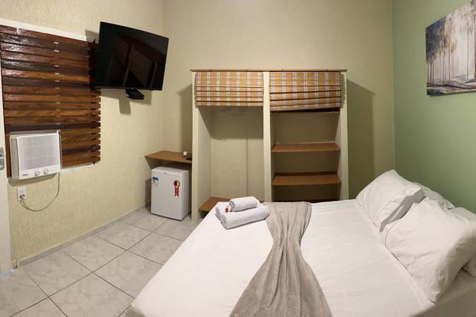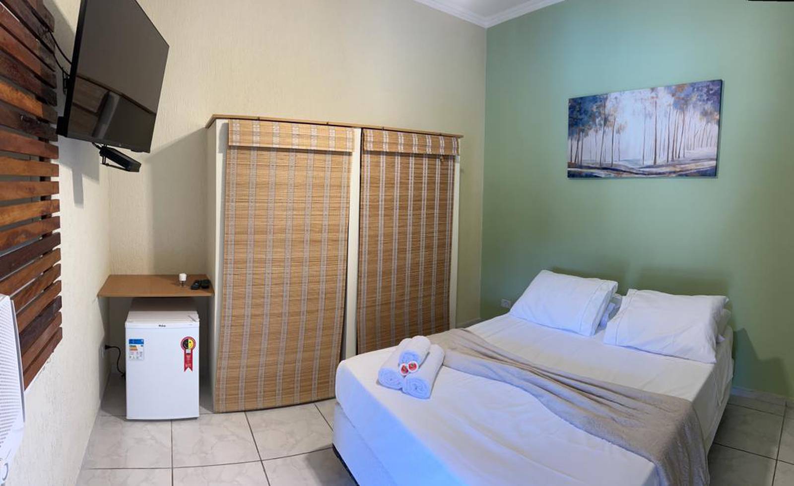 Acomodação perfeita para 03 hóspedes com uma cama casal + uma cama auxiliar solteiro, TV 43” com pacote de canais Vivo TV e as seguintes comodidades: